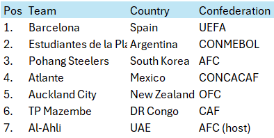 | 19 Dec | Pohang Steelers | South Korea | 1 | 1 | Atlante | Mexico |