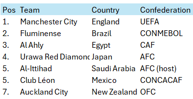 | 19 Dec | Urawa Red Diamonds | Japan | 0 | 3 | Manchester City | England |
